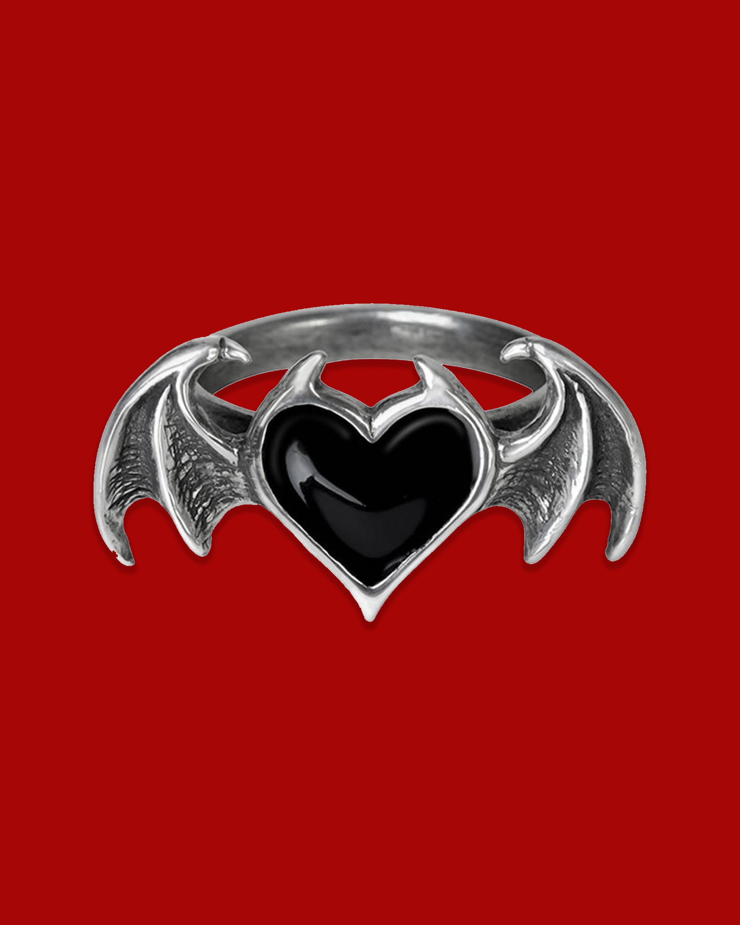 A delicate pewter ring of a bat-winged, black enamel heart spanning just over the width of the finger.