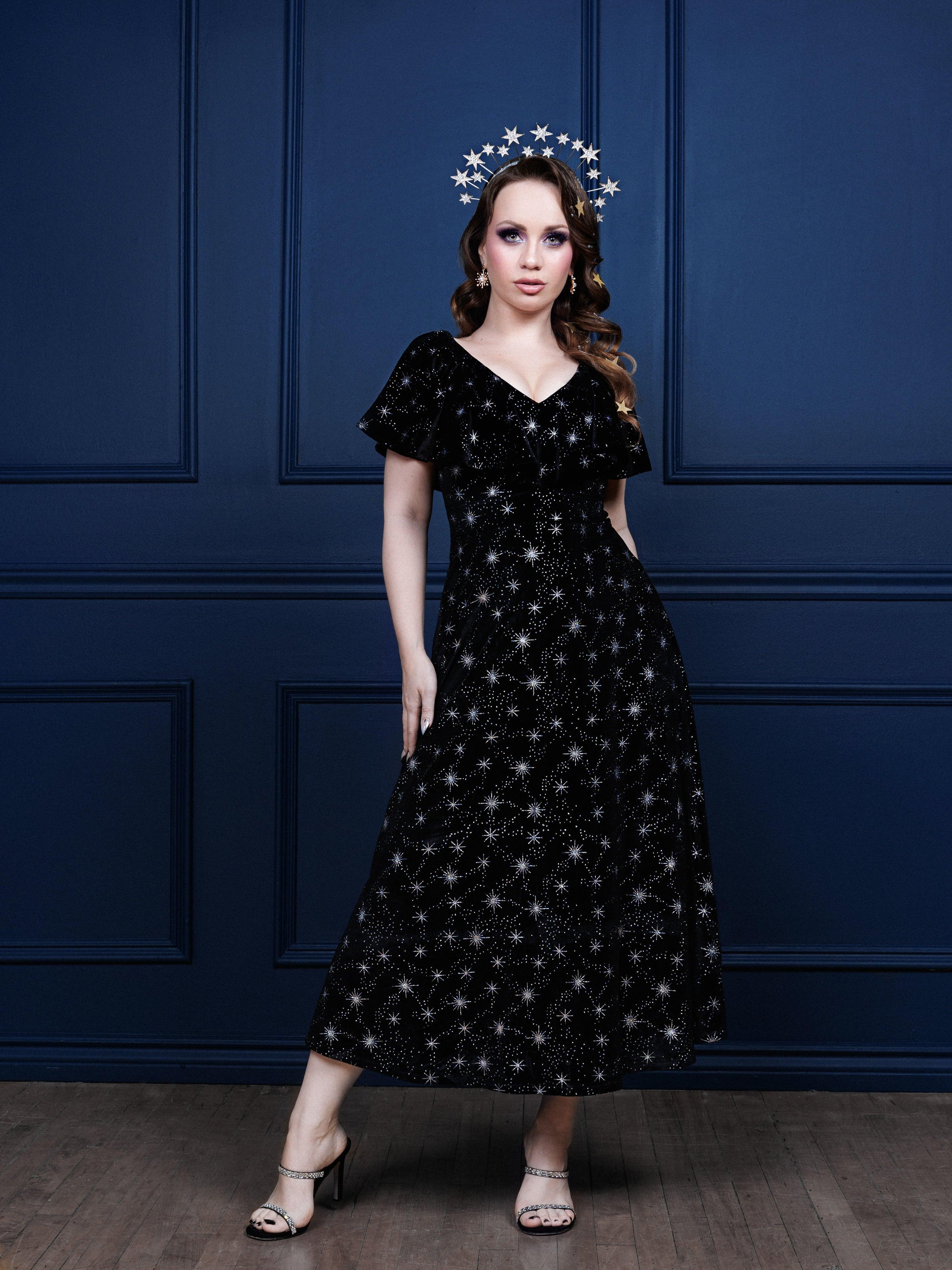 The Heavenly Body Dress is captivating fusion of vintage elegance and modern allure. This Valentino dupe is made from sumptuous black velvet adorned with a dazzling starburst print, this dress evokes a sense of timeless glamour. With vintage-inspired butterfly sleeves and side slits, it effortlessly combines the charm of the 1940s with the sophistication of art deco design. The dress features a flattering pull-in waist that accentuates your curves, and its midi length adds a touch of formality. Whether you're stepping into a New Year's celebration or any special occasion, the Heavenly Body Dress is your go-to choice for making a striking statement with grace and style.