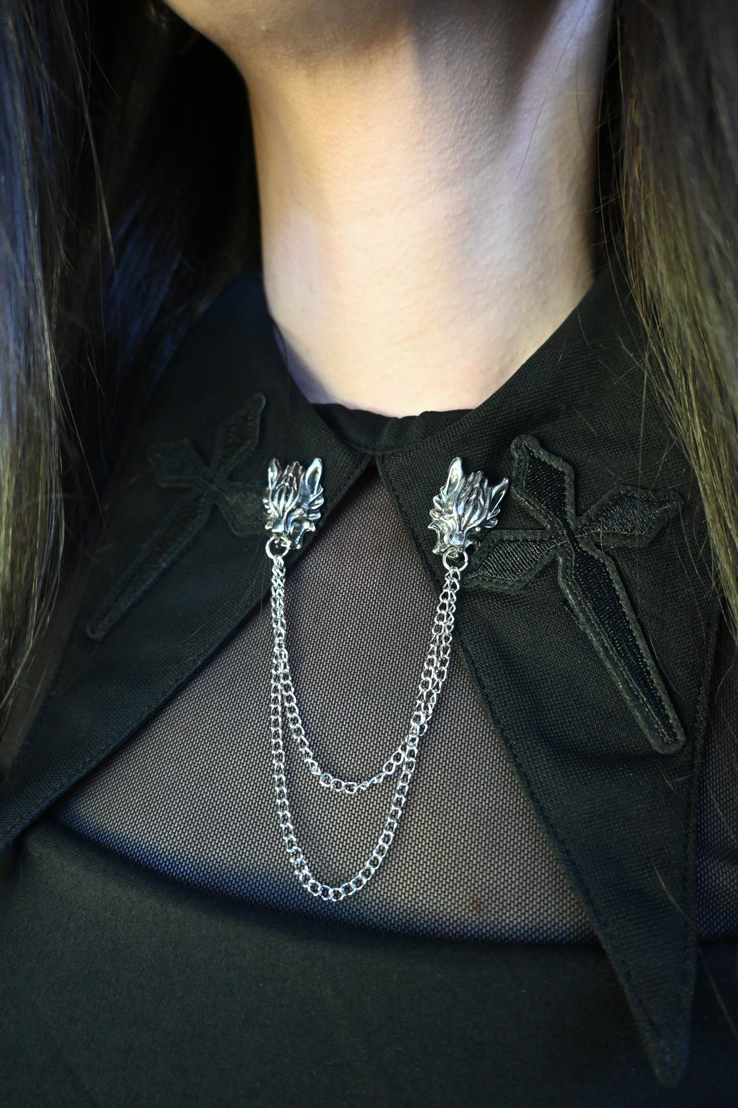 This striking accessory features a polished silver‑metal wolf clip joined by draped chain links designed to clasp along your collar or lapel for a bold gothic touch. The stylised wolf motif – its jaws slightly open, ears alert – adds fierce, animal‑edge character, while the chain gives movement and visual weight to the piece. Designed to sit securely on jacket collars, shirt lapels or even heavy fabric bags, this collar clip elevates dark‑fashion outfits with a modern creature‑feature statement.