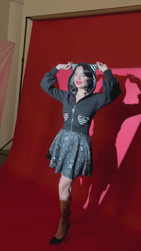 With its distinctive features, this sweater is sure to turn heads wherever you go. The puffed bishop sleeves add a touch of drama, while heart-shaped striped pockets offer a playful detail. Complete with striped puff cat ears and a signature skull zipper pull, this sweater is as unique as it is stylish.