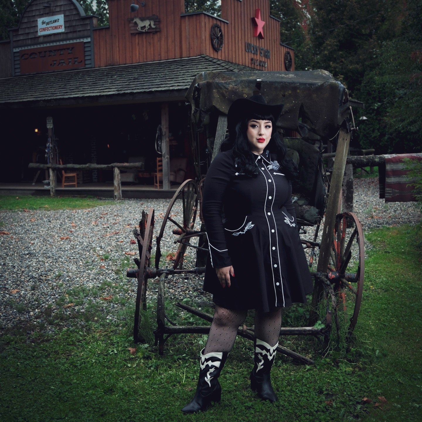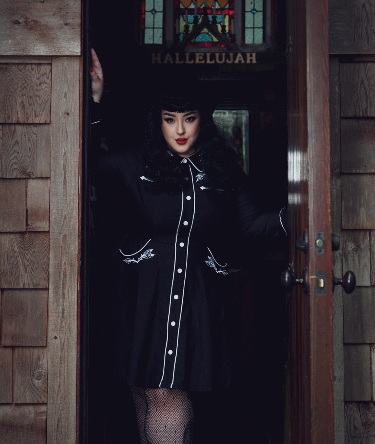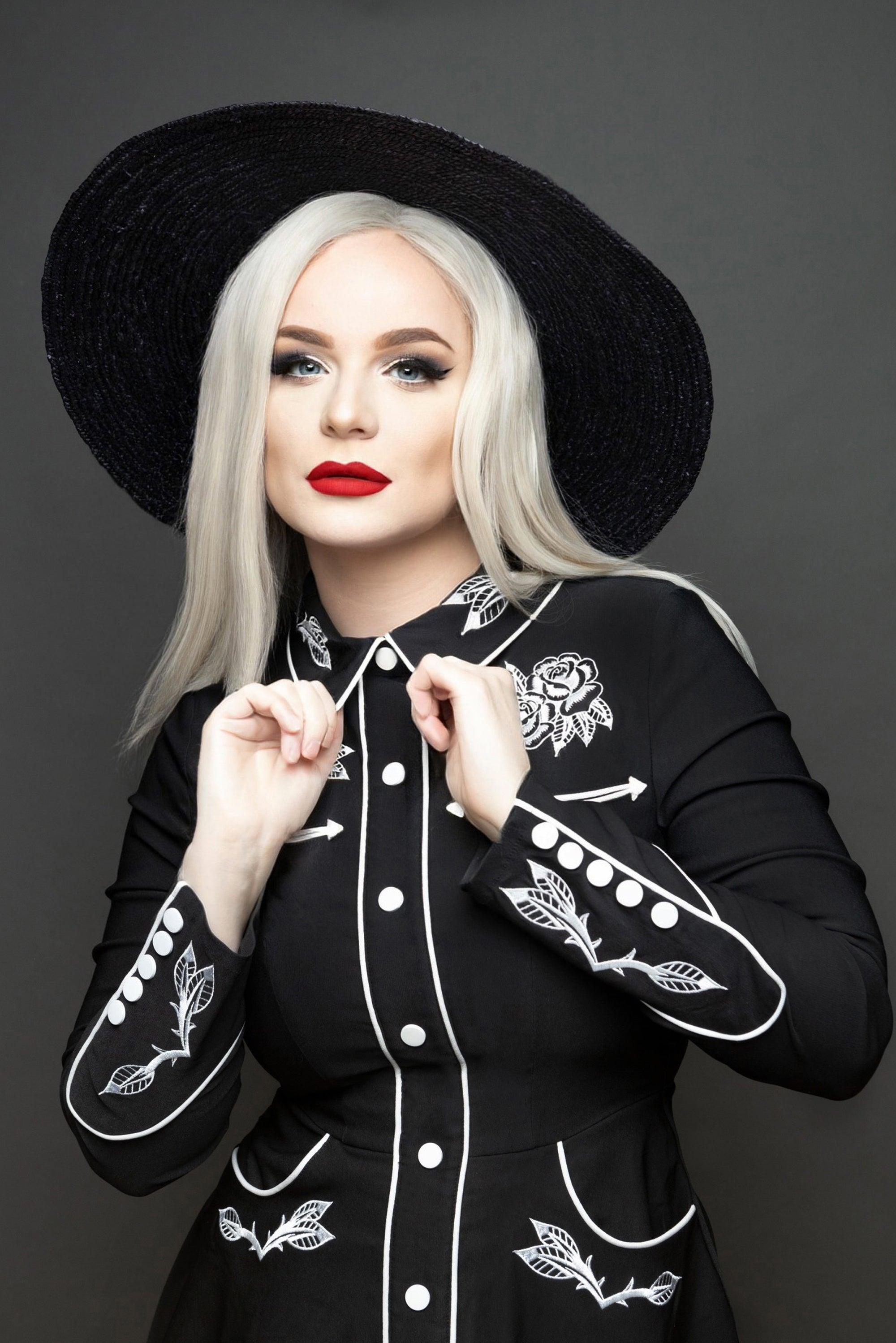 Introducing the return of our beloved June Dress, now upgraded with a stylish skater skirt and functional pockets! This dress boasts long piped sleeves adorned with faux snap cuffs, creating a seamless and chic appearance. Customized with intricate rose and thorn embroidery on the collar, cuffs, bust, and hips, the white piping adds a finishing touch to the overall aesthetic. The skater skirt cut not only offers a playful and flattering look for all body types but also includes deep pockets for convenient storage of your essentials.