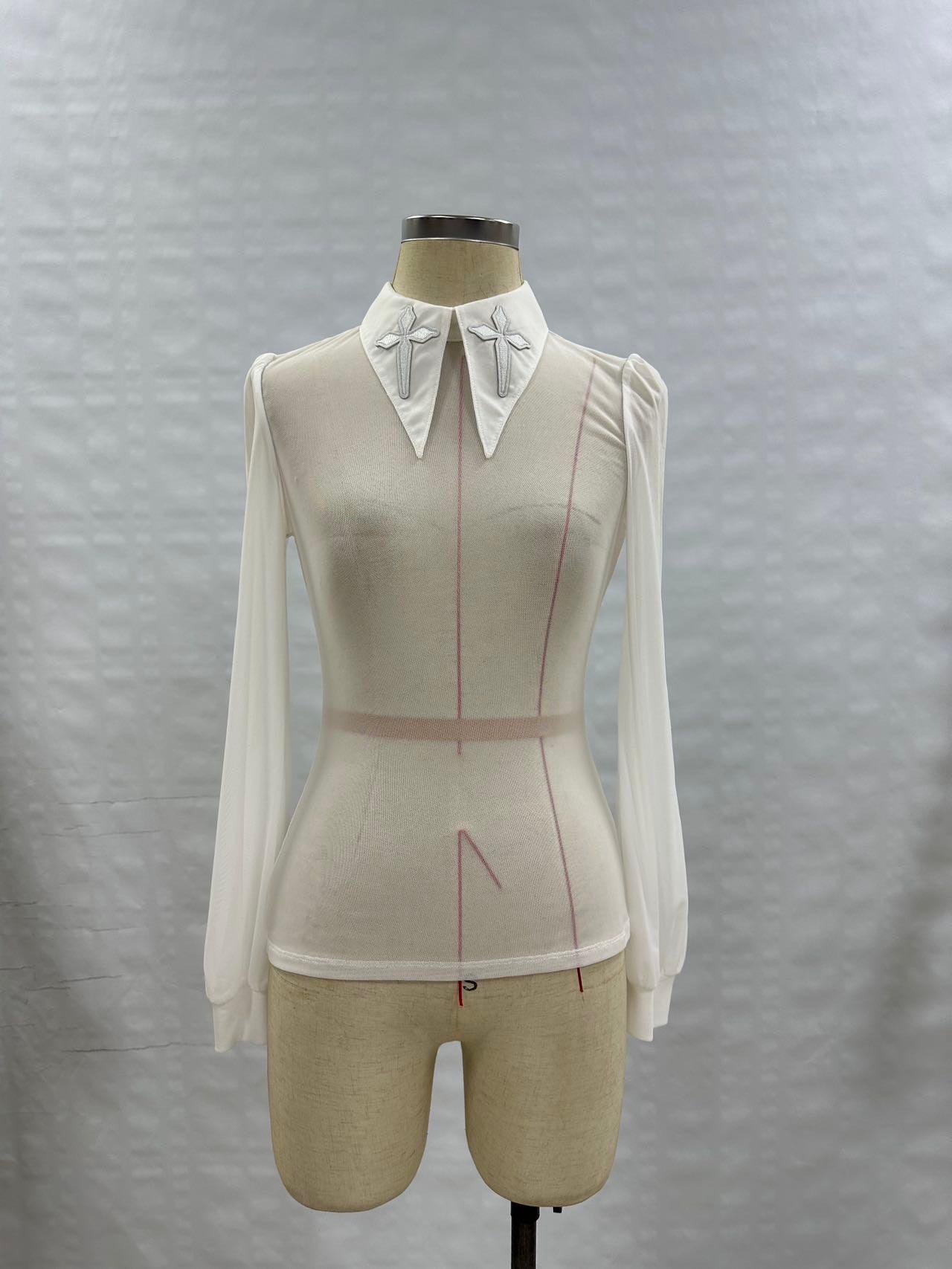 Reach out and touch faith in this long-sleeve mesh top with bold embroidered cross patches on an extended pointy collar that are sure to turn heads. See-through mesh is stretchy for all your dancing needs. A keyhole cut-out shows off a bit of back, but how daring you make this piece is up to you. Available in virginal white, not-at-all-basic black, and electric purple.