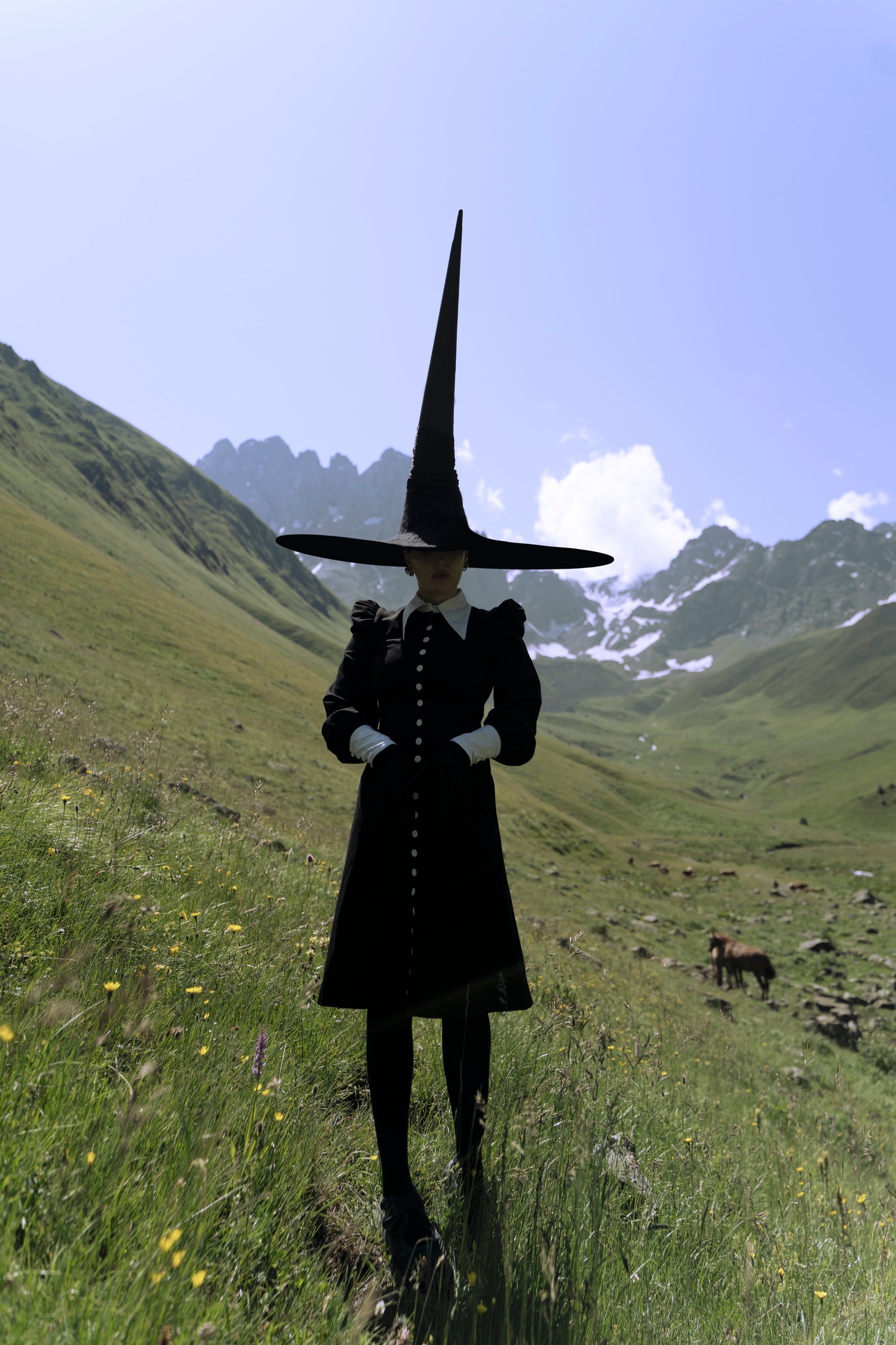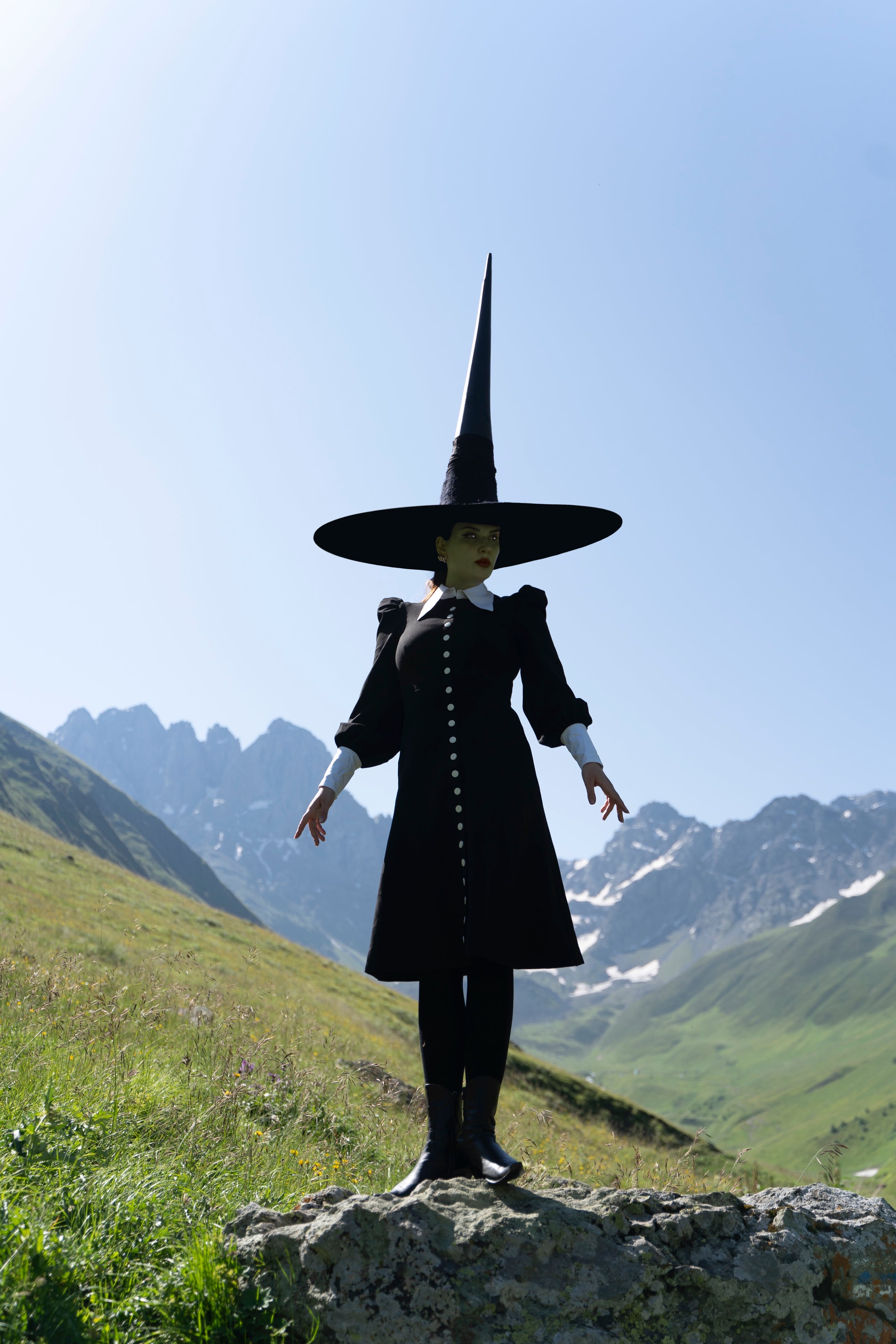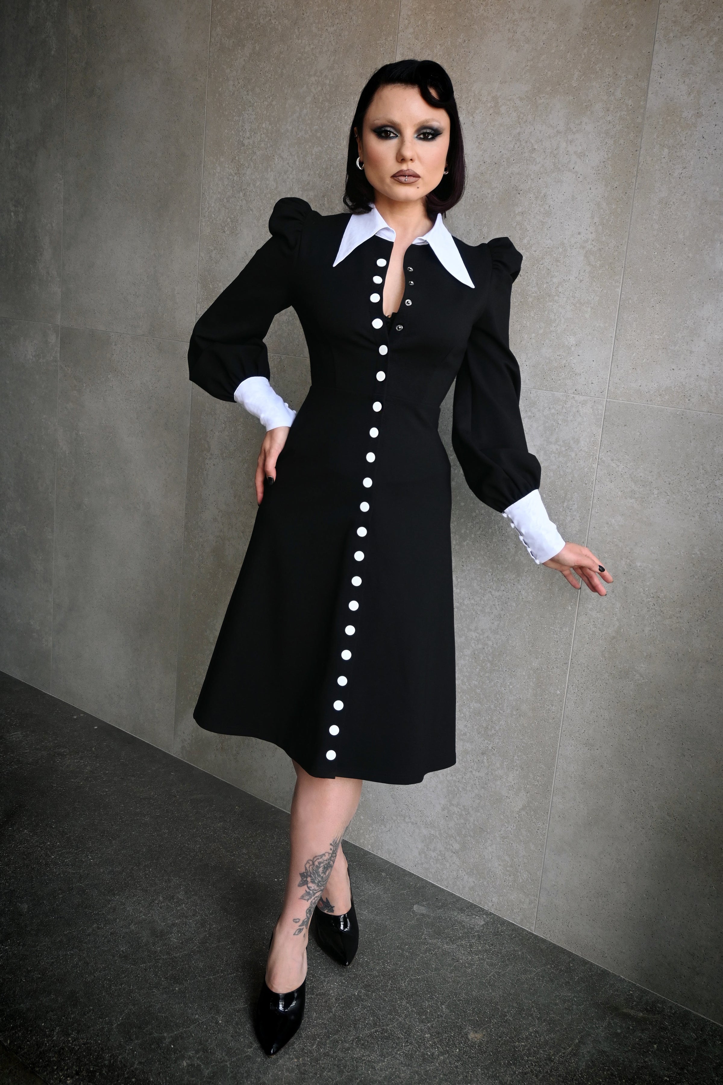 Command the room with a silhouette that whispers of magic and timeless style. Crafted from thick ponte for a structured fit, the Naya Dress features a pointed white cotton collar and cuffs, dramatic puffed sleeves, and a line of bold white buttons running down the front. The tailored bodice flows into a slightly flared midi length skirt, striking the perfect balance between elegance and power—a modern-day witch’s wardrobe essential.