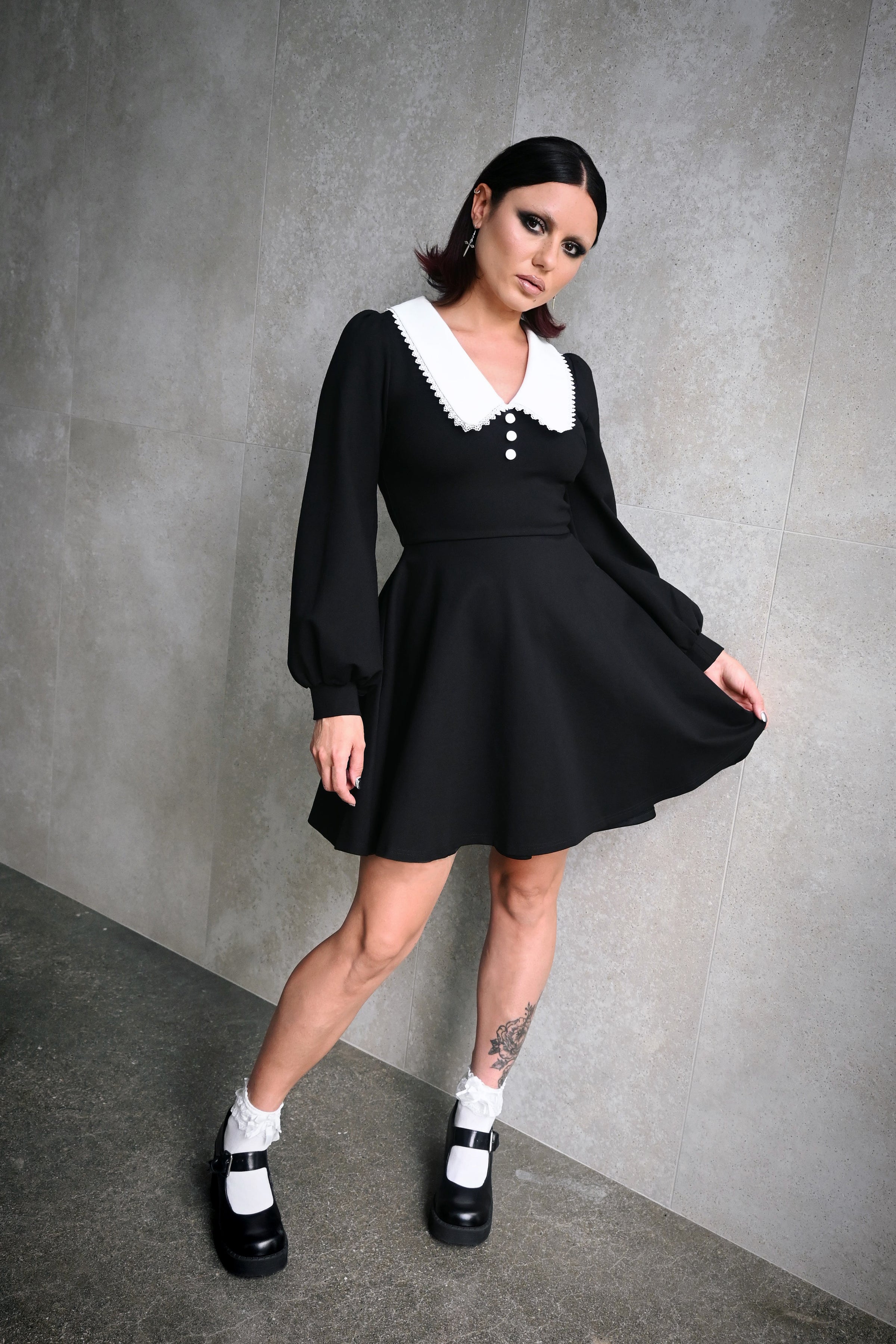 A 1960s-inspired ponte black skater dress with timeless details. The oversized white bib collar is accented with scalloped trim, while fixed white buttons highlight the front bodice. Finished with flowing bishop sleeves, the Dollhouse Dress balances playful charm with a classic silhouette.
