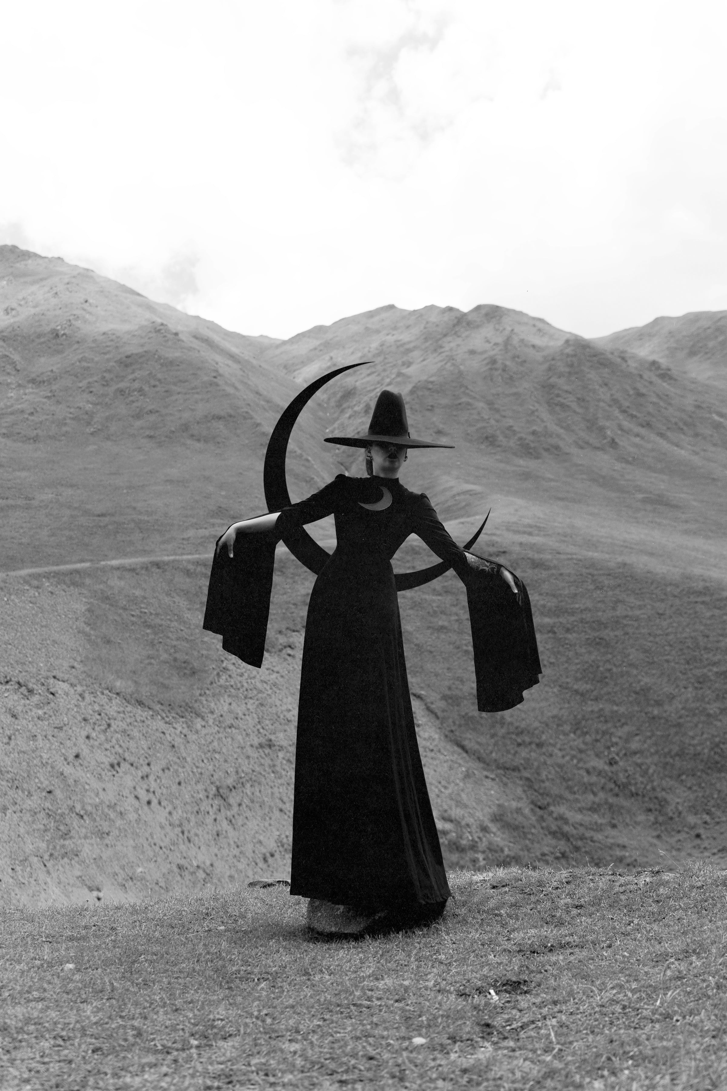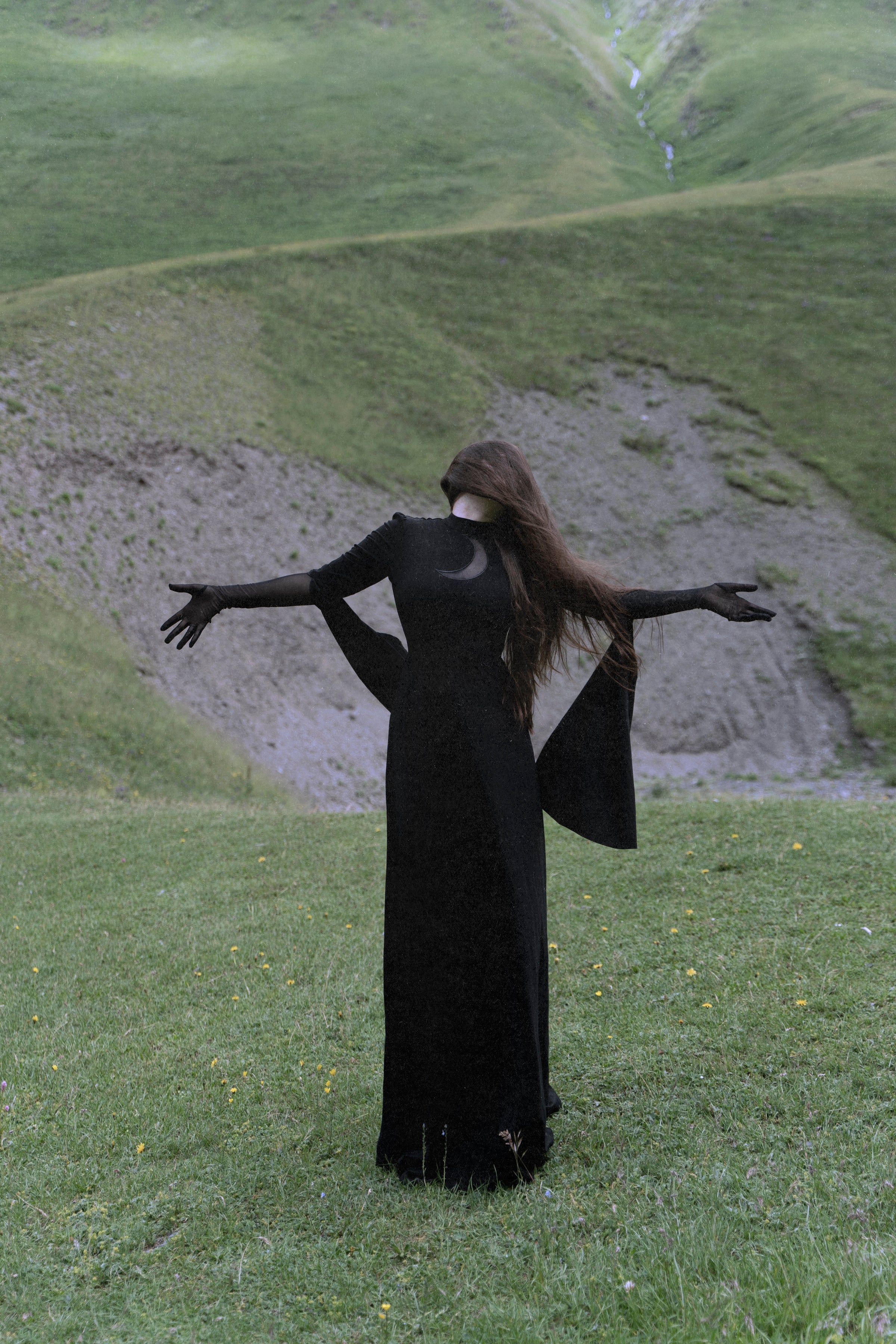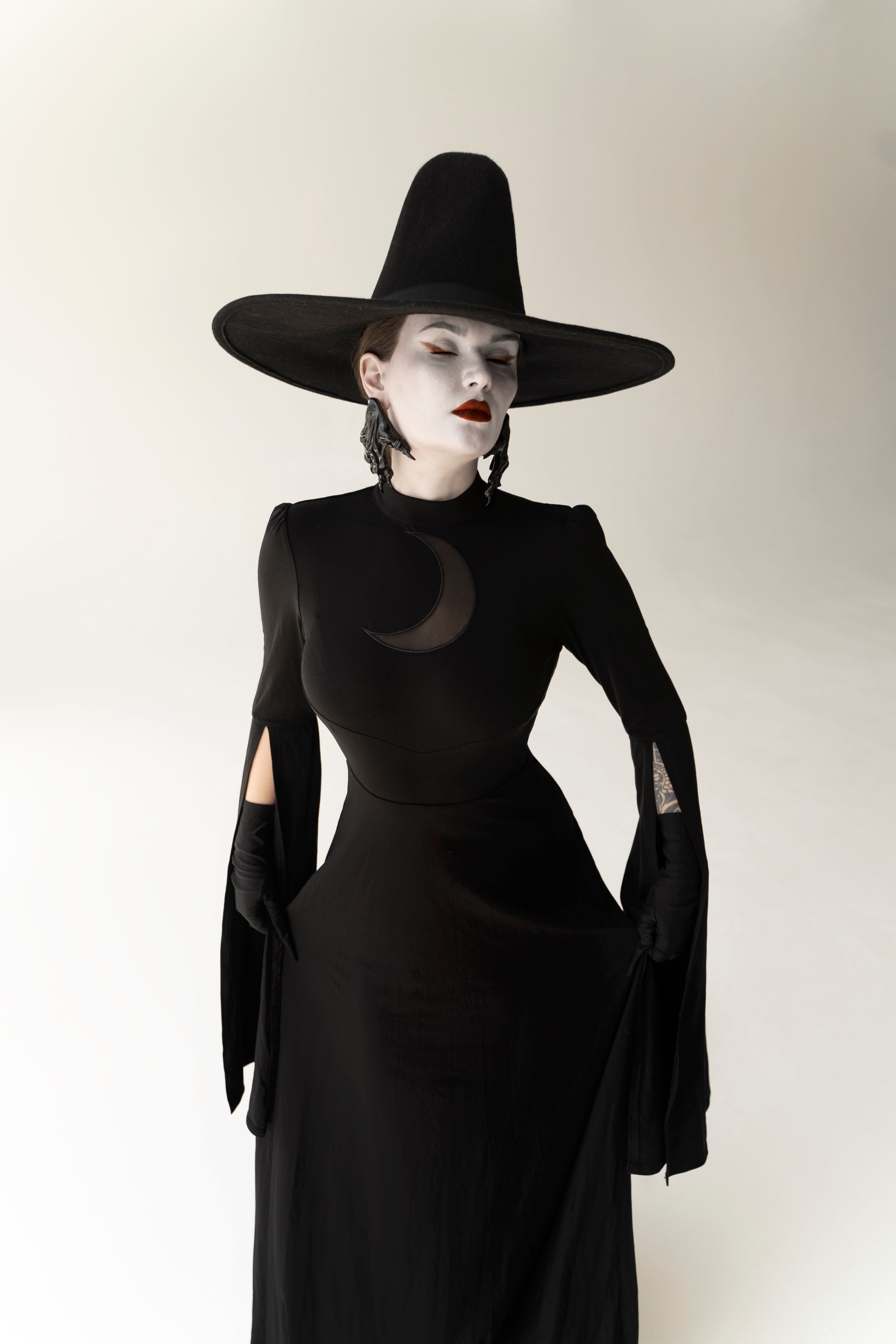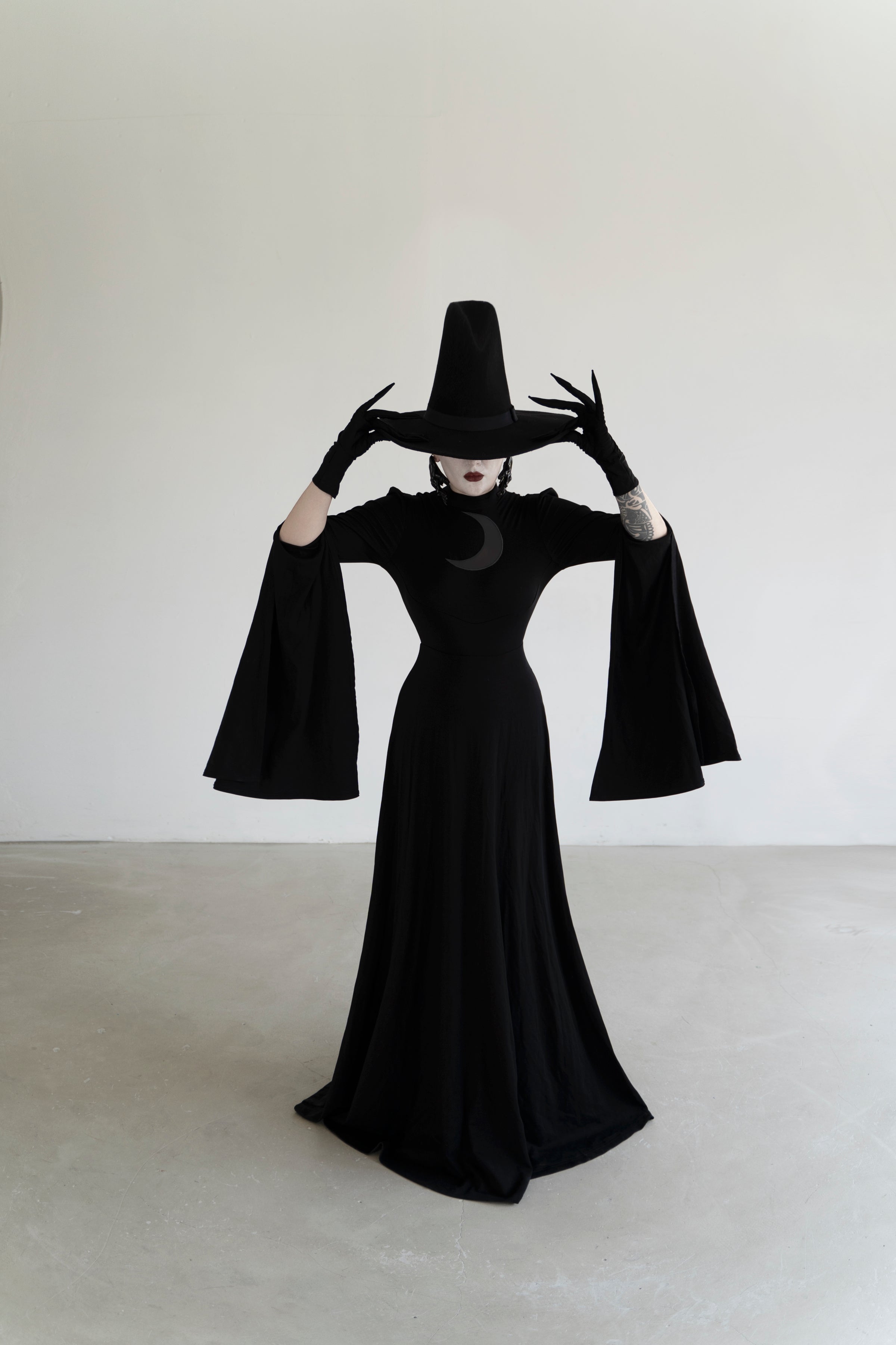 Draped in darkness, the Moonveil Dress is an ode to the night. Cut from high-stretch polyester for effortless movement, it features a sleek mock neck, sheer mesh crescent moon resting at the chest and flowing cape sleeves parted dramatically at the elbows. A dress for those who walk between worlds.