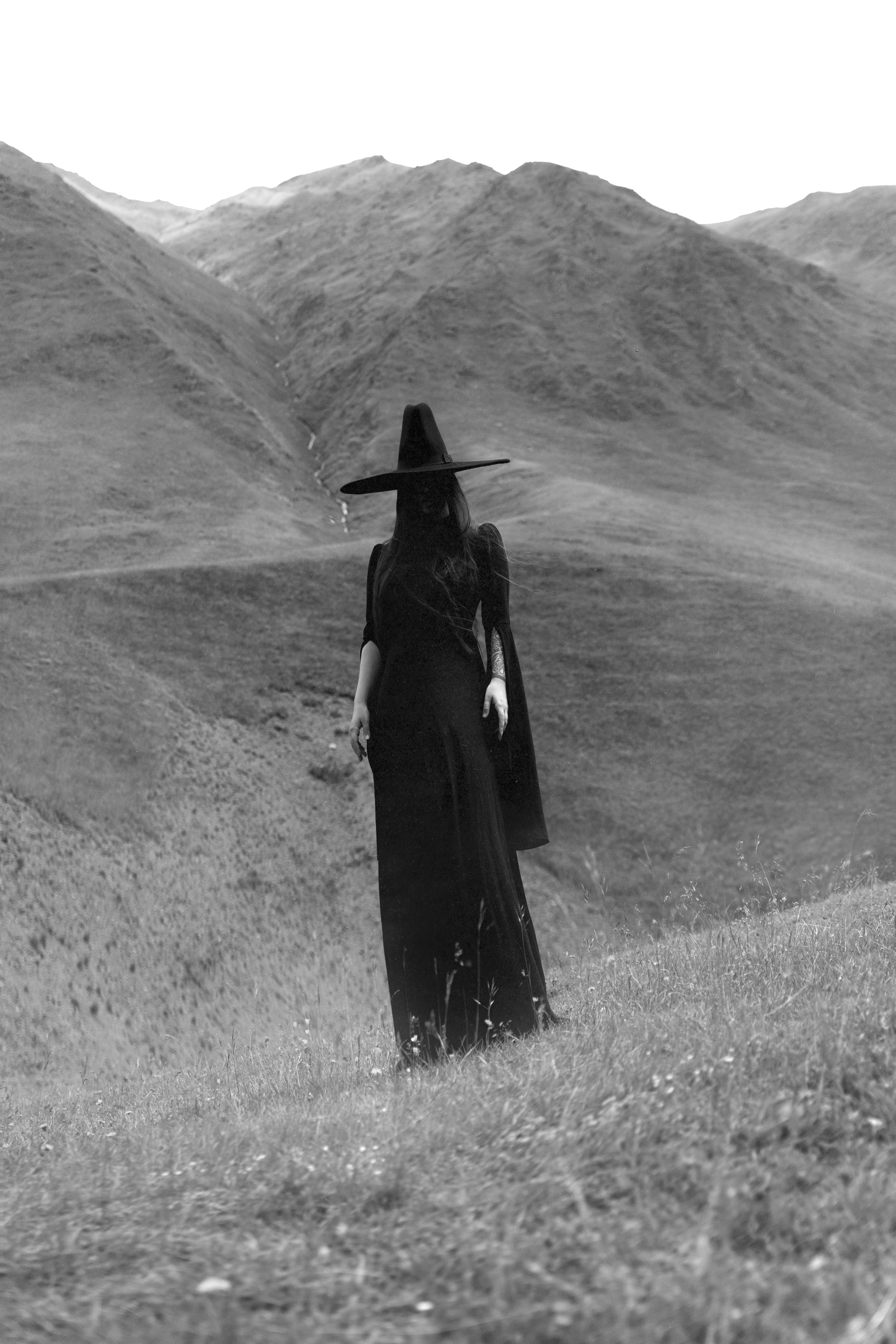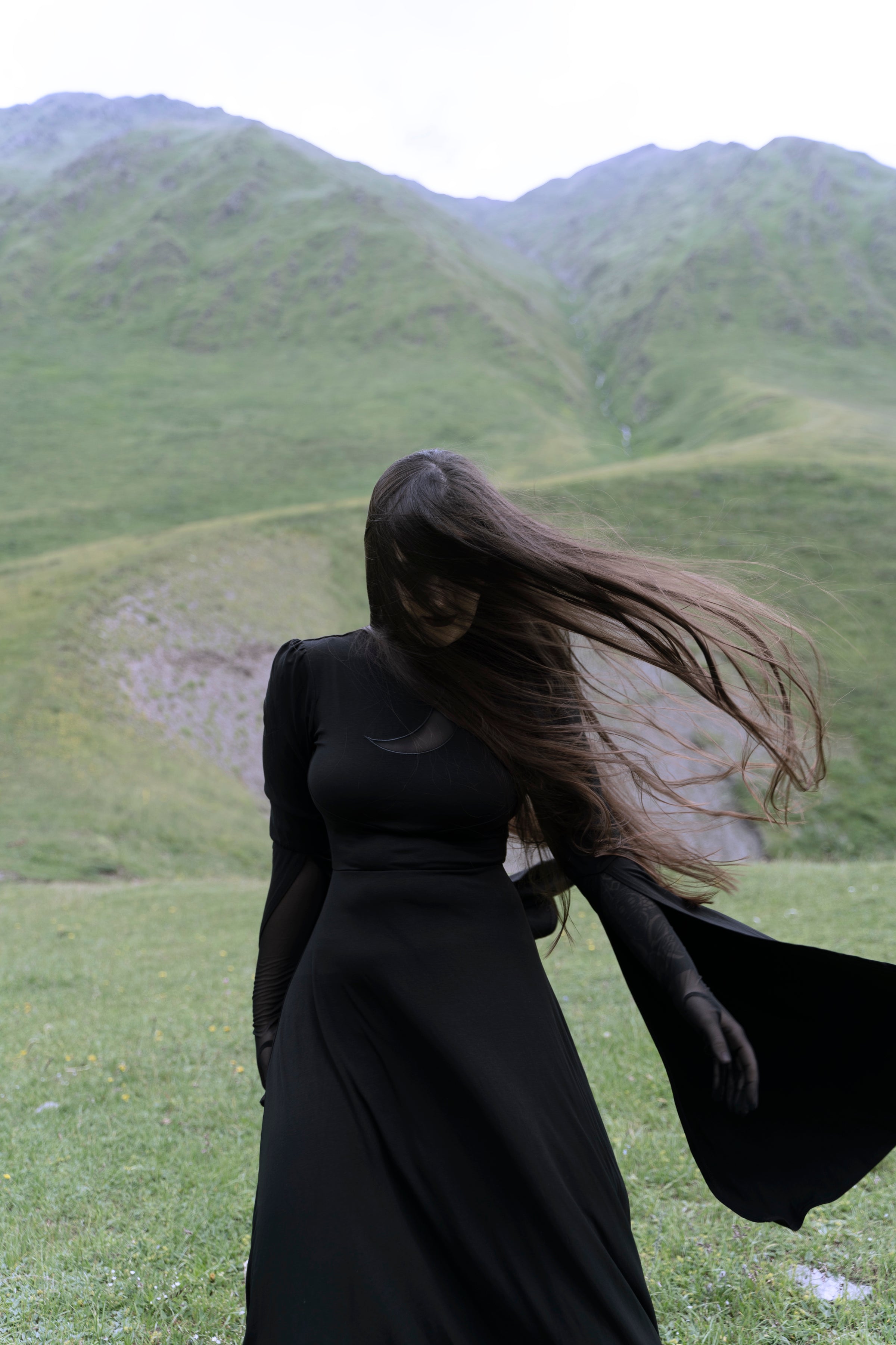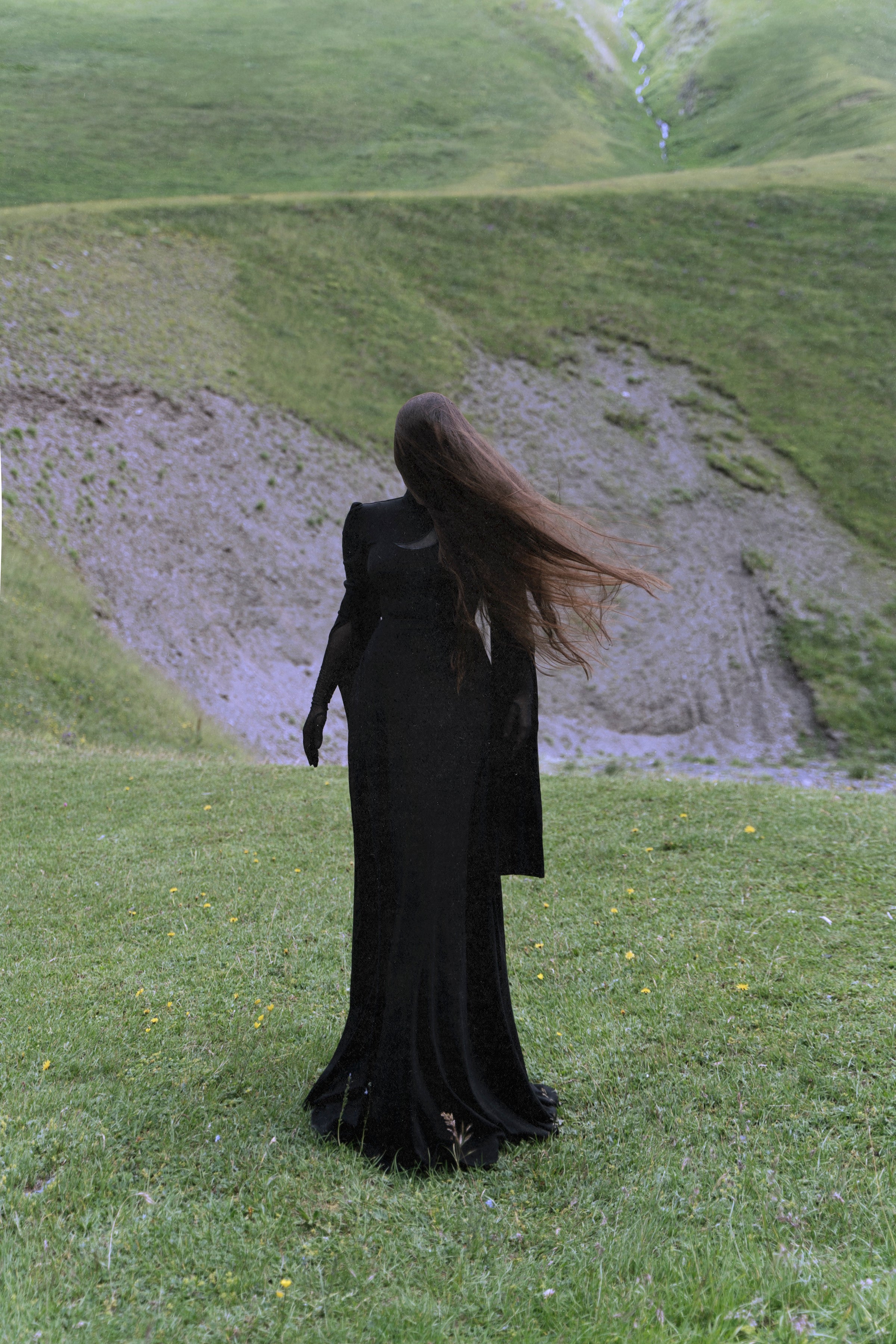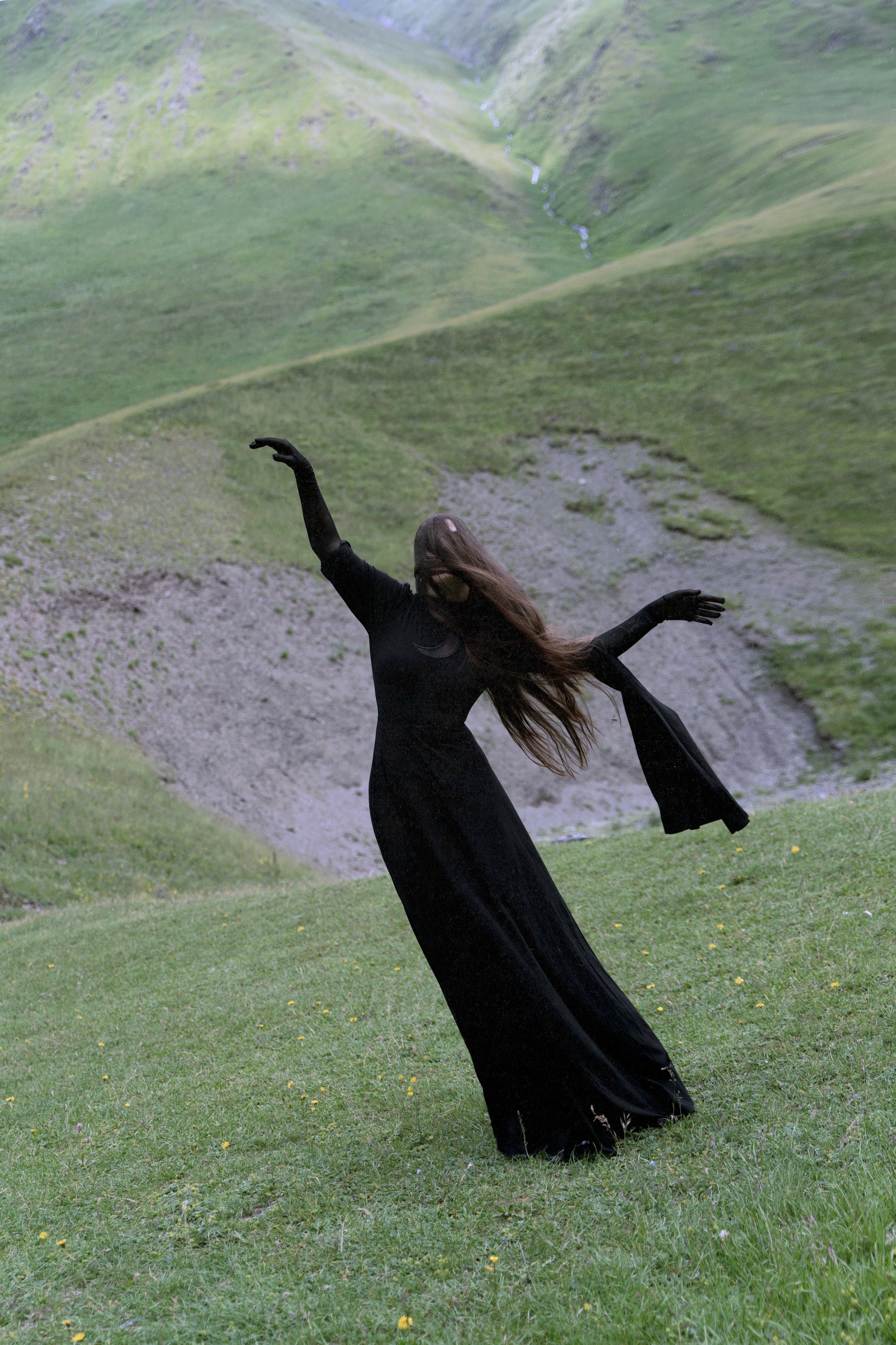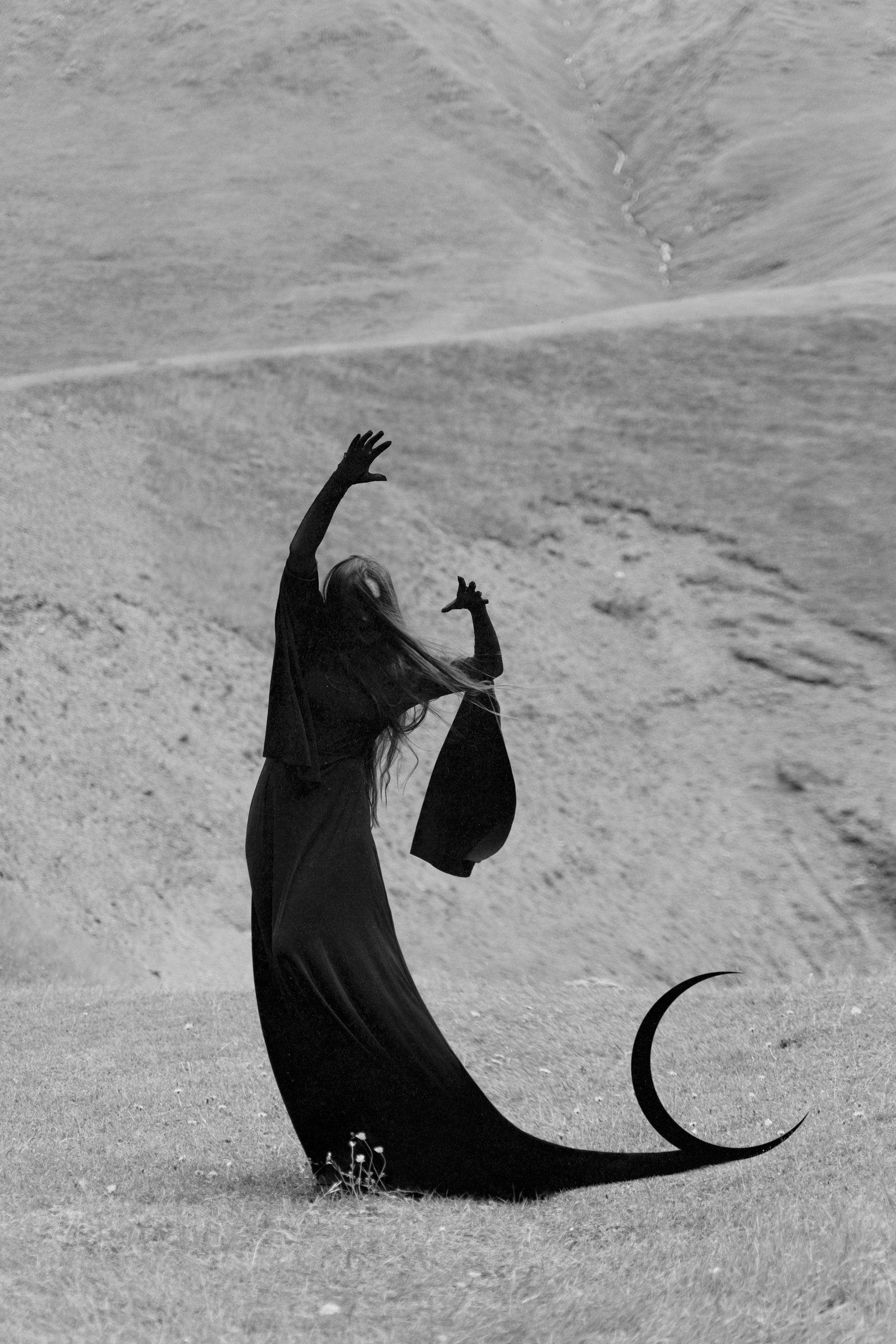 Draped in darkness, the Moonveil Dress is an ode to the night. Cut from high-stretch polyester for effortless movement, it features a sleek mock neck, sheer mesh crescent moon resting at the chest and flowing cape sleeves parted dramatically at the elbows. A dress for those who walk between worlds.