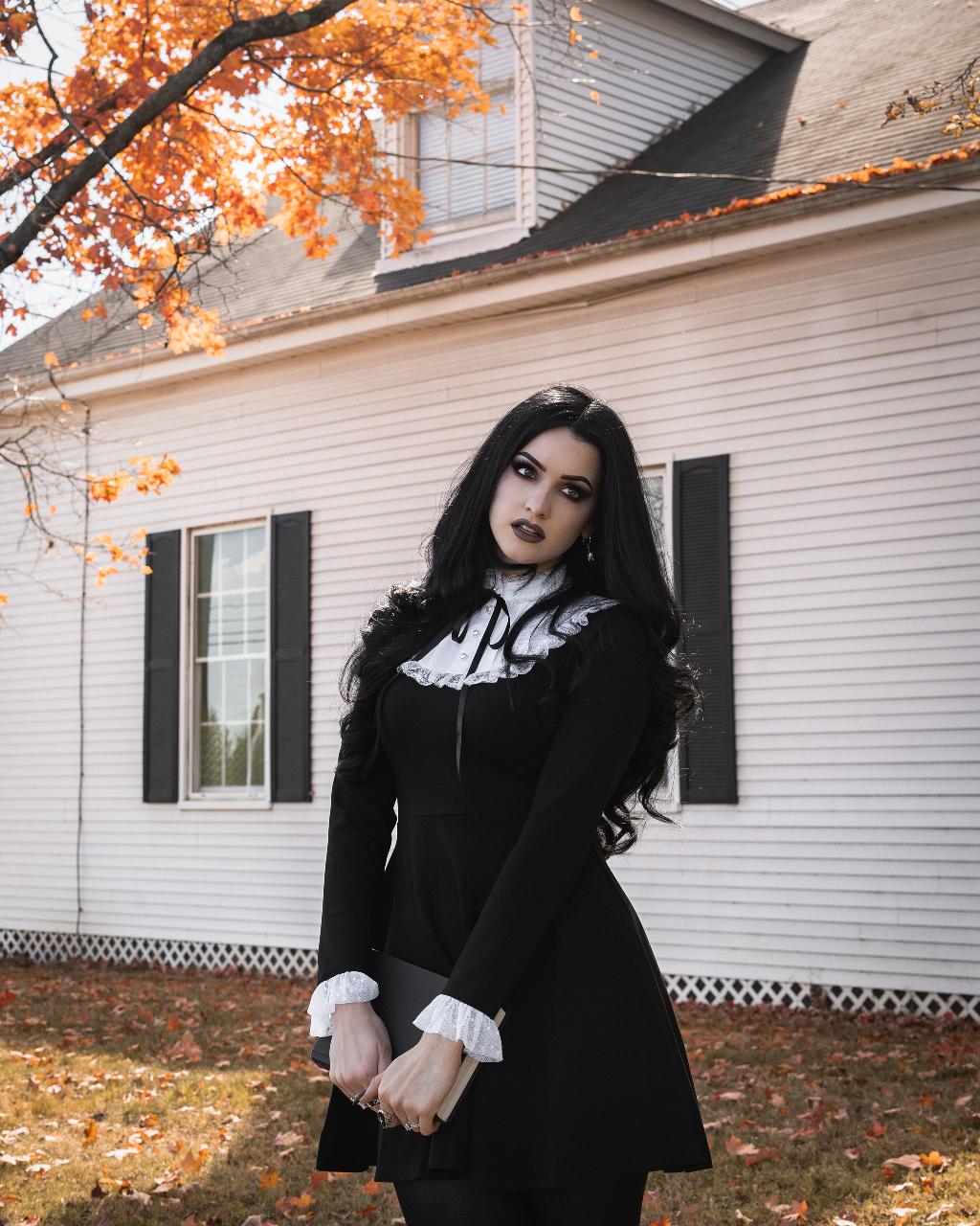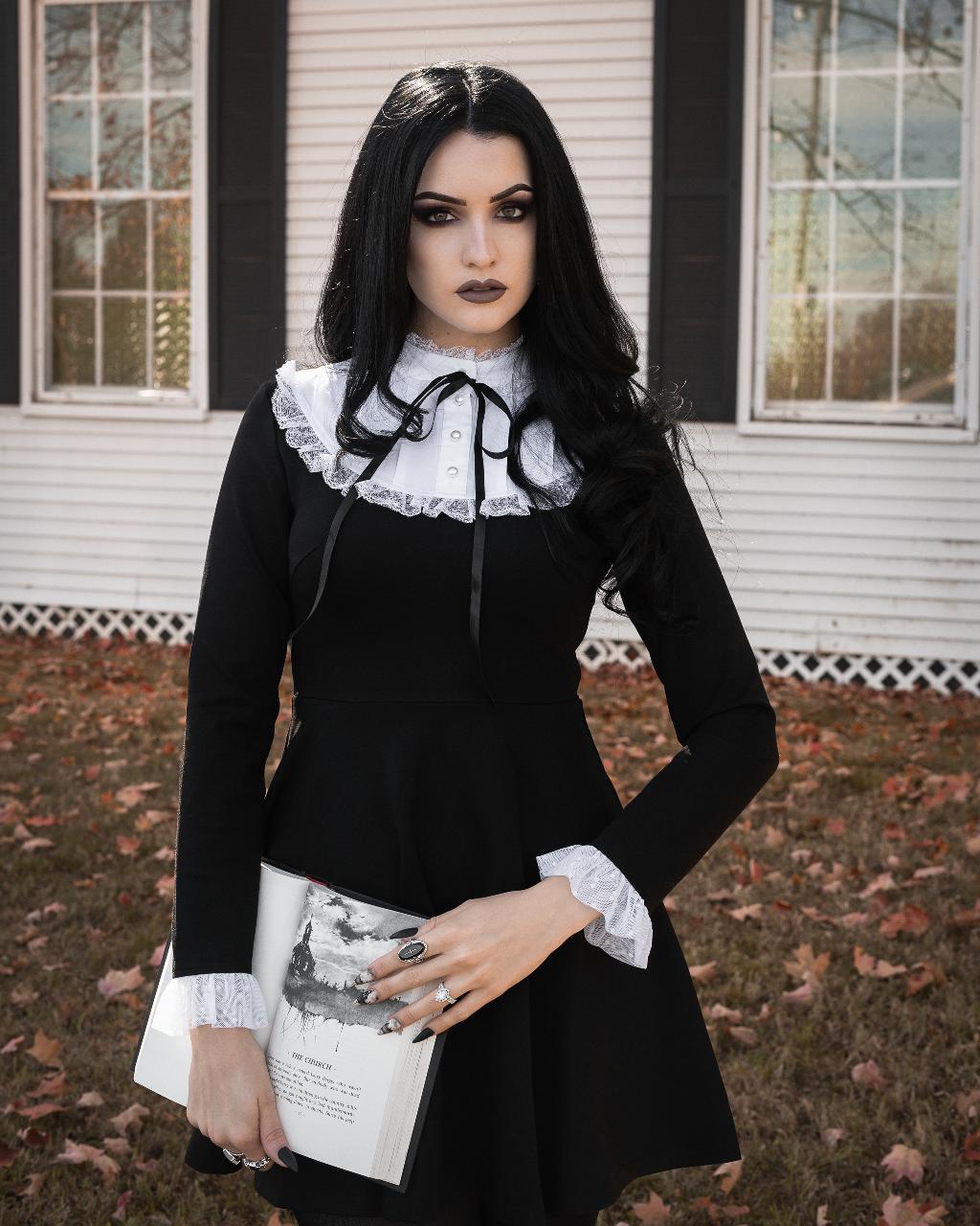 Equal parts mysterious and delicate, the black Salem Dress takes cues from the fashion of the 16th century. With a frilled white neckline and sleeves, a fixed bow, and a cinched waist, this dress translates the era’s iconic opulence into something both modern and timeless. The Salem Dress offers a comfortable stretch, mock button detailing, and a functional back zipper for effortless wear.