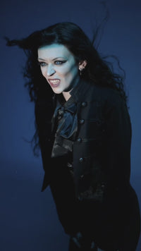 A structured cropped jacket with military-inspired detailing. Features decorative braided trim, embossed ouroboros button accents, and a high mandarin collar. Made from a structured yet stretchy fabric for a comfortable fit. The open-front design makes it perfect for layering over dresses or fitted tops.