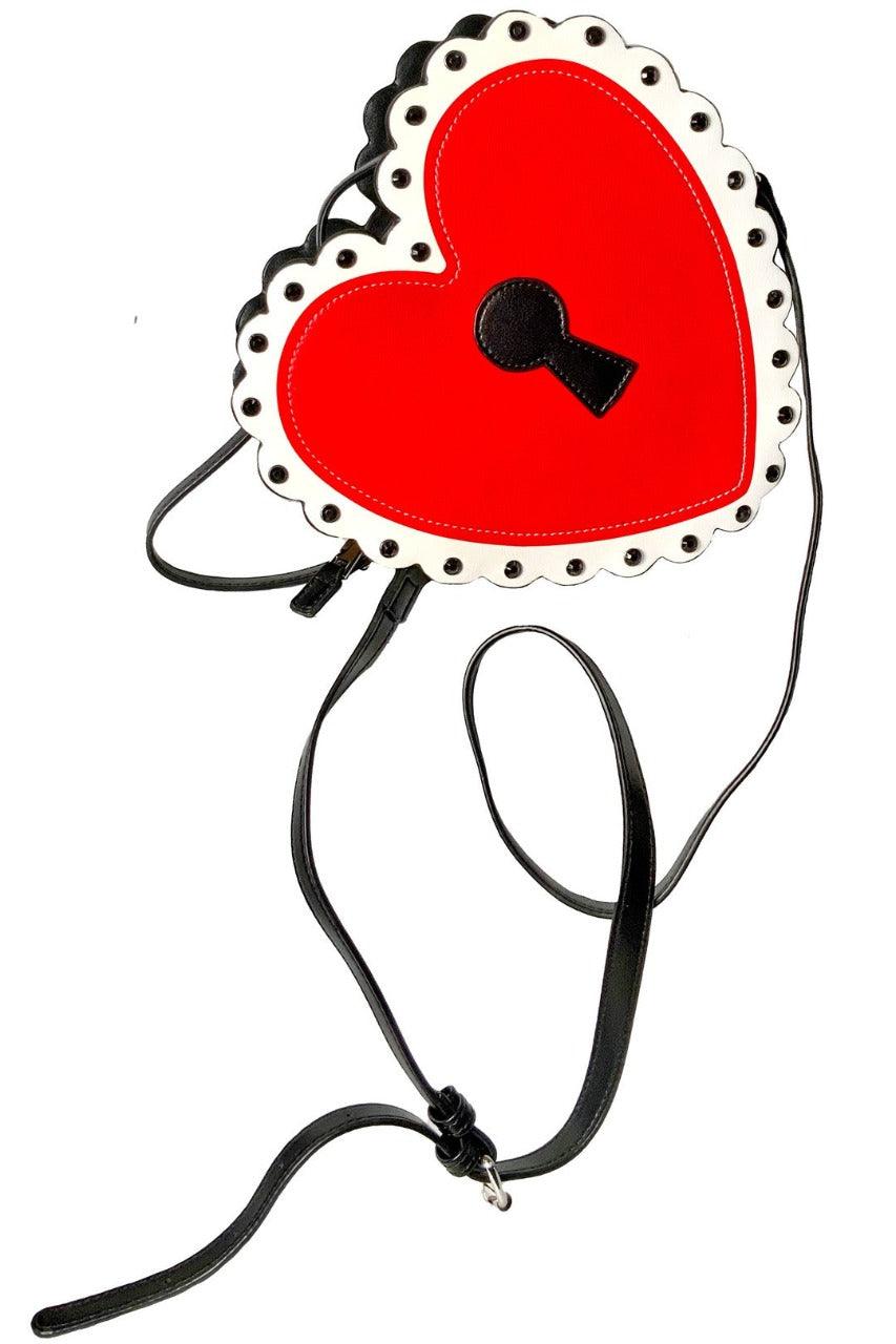 Unlock the door to irresistible style with our Heart Locket Purse—the ultimate statement piece that holds the key to our hearts. Inspired by vintage valentine cards, this purse features a white scallop border adorned with black jewel studs, a matte red heart, and a striking black matte keyhole center.
